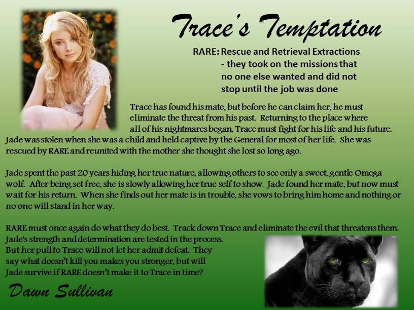 Trace has found his mate, but before he can claim her, he must eliminate the threat from his past. Returning to the place where all of his nightmares began, Trace must fight for his life and his future. Jade was stolen when she was a child and was held captive by the General for most of her life. She was rescued by RARE and reunited with the mother she thought she lost so long ago.