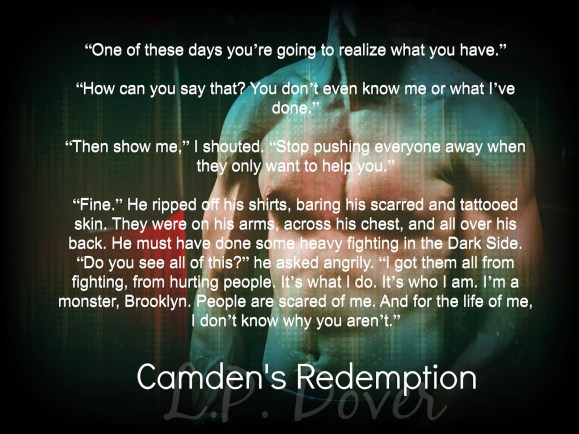 Undercover agent, Brooklyn Avery, has been assigned to Camden’s case, to watch and protect him. For months, she’s been in the shadows, keeping her distance. All of that changes when the mission takes a dangerous turn and she needs to get closer to protect him. Their love is forbidden, but once they see past each other’s scars, they realize they have what it takes to heal the other. Unfortunately, Camden still has a price to pay for his sins.