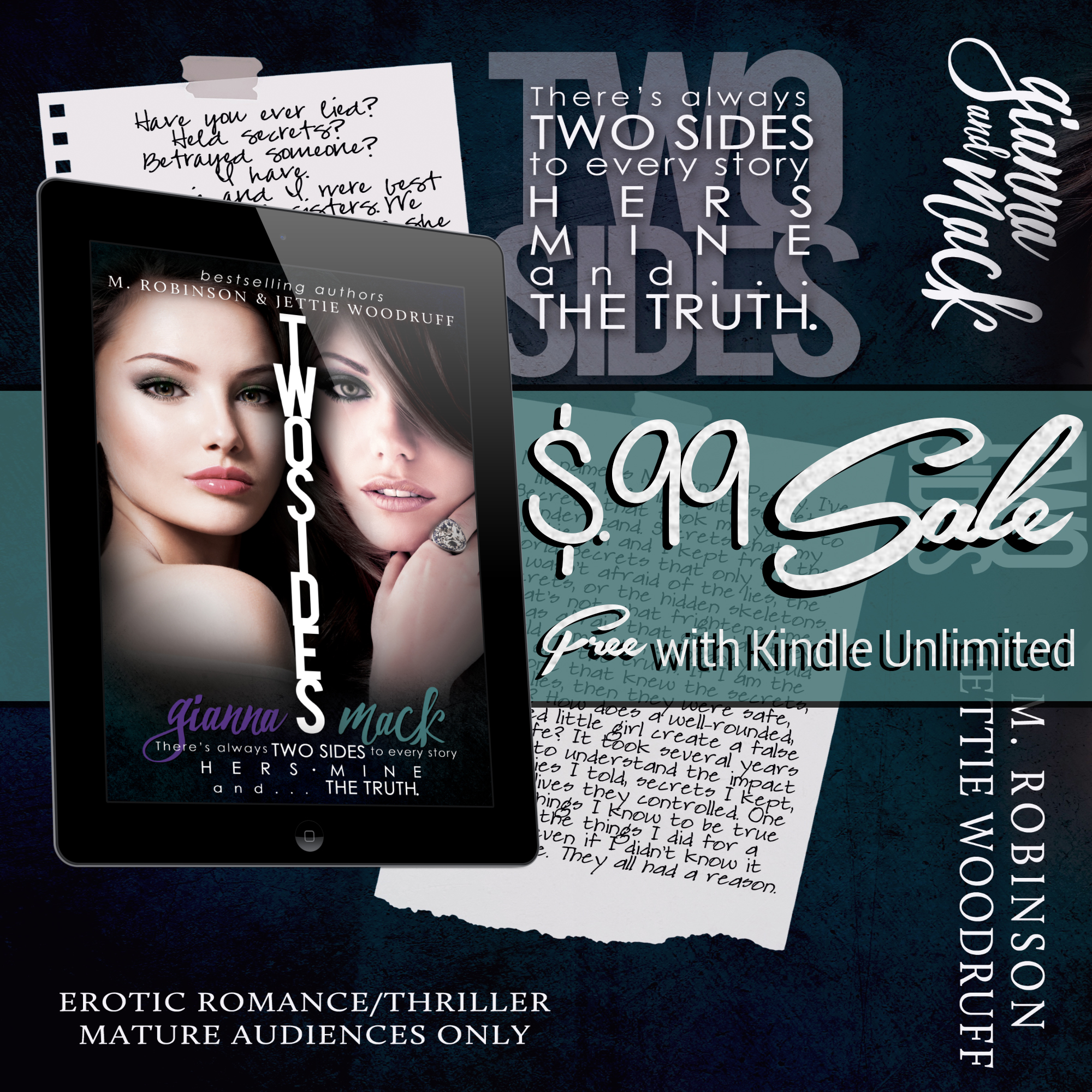 There are always three sides. In this case, it’s mine, Gia’s, and the truth. Once you have read them both, you’re free to judge who you want. You can decide what the secrets are, who lied, and who told the truth.